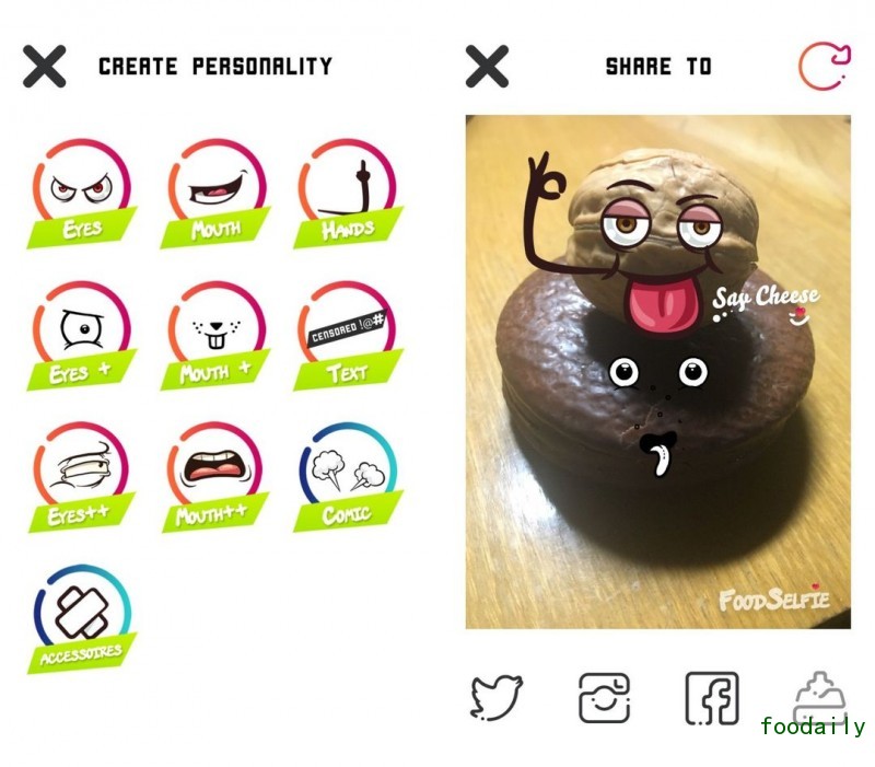 为此,这个应用内提供了眼睛、嘴巴、手臂等多达 130 种贴纸。待添加上这些夸张的元素到食物们上后,就好像它们变成了人样,在摆拍了。