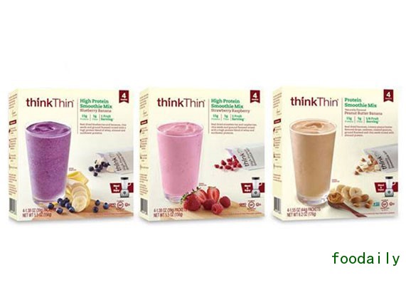 thinkThin公司推出一款高蛋白含量的水果奶昔。这款产品将新鲜水果、奇亚籽、亚麻仁以及高达15 g的蛋白质混合,并加入杏仁乳和冰沙制备而成。目前,这款水果奶昔有蓝莓-香蕉、草莓-树莓以及花生酱-香蕉等多种风味。