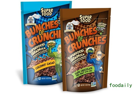 Bakery on Main公司新推出的名为Bunches of Crunches的一款巧克力燕麦卷,富含如奇亚籽、可可、苋菜和小米等传统谷物,每一袋产品能提供10 g左右的全谷物。该产品拥有椰肉-可可以及黑巧克力-海盐等不同风味。