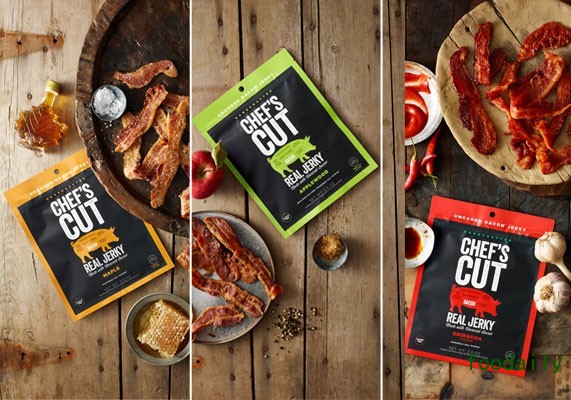 Chef’s Cut Real Jerky公司期待培根能成为其最新bacon jerky产品生产线上的宠儿,这款产品由未处理的培根慢慢熏制而成。目前这款肉干产品主要有三种风味,包括拉差辣椒酱、枫木以及苹果木(applewood.)。所有系列均不含麸质,未添加硝酸盐。