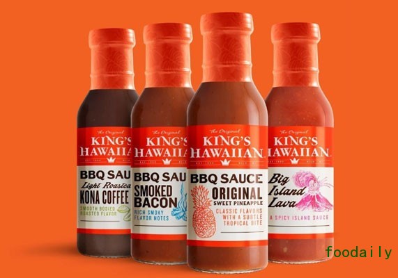 King’s Hawaiian公司推出了四款夏威夷海岛风情的BBQ烤肉酱。这款产品将夏威夷本地的菠萝甜香风味与饱满强烈的烤肉风味结合在一起。此外,The Big Island Lava sauce这款BBQ烤肉酱因墨西哥胡椒的加入而更加辛香和麻辣,饱含海岛特征风味,The Kona Coffee barbecue sauce则通过加入Kona咖啡从而增强烤肉酱中的特征烤肉风味。