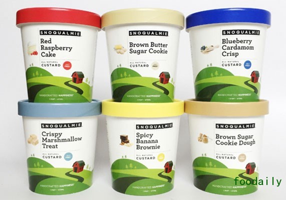 Snoqualmie Ice Cream公司为旗下的纯天然蛋奶冻(all-natural frozen custards)推出了6种全新风味。全新风味系列产品含有高达14%的乳脂、更多的奶油和鸡蛋等成分。产品小批量封装后进行巴氏杀菌,添加非转基因蔗糖,不含生长激素rBST、人工合成色素、风味调料以及高果糖浆等成分。The Blueberry Cardamom Crisp Custard系列产品是将西北地区蓝莓、燕麦以及肉桂与蔓越莓、豆蔻等有机搭配混合;The Red Raspberry Cake Custard系列产品是以蛋糕糊、覆盆子以及白蛋糕片为基料;The Spicy Banana Brownie Custard系列产品将巧克力蛋糕与香蕉肉桂合理搭配在一起;The Brown Butter Sugar Cookie Custard系列产品中的组分包括褐色黄油以及松软饼干碎片等;The Brown Sugar Cookie Dough Custard系列产品中混搭了巧克力碎屑、曲奇饼等成分并以红糖调节甜度;The Crispy Marshmallow Treat Custard系列产品以家乡风情的米粉煳为基料,是一款专为竞赛获奖者准备的风味产品。
