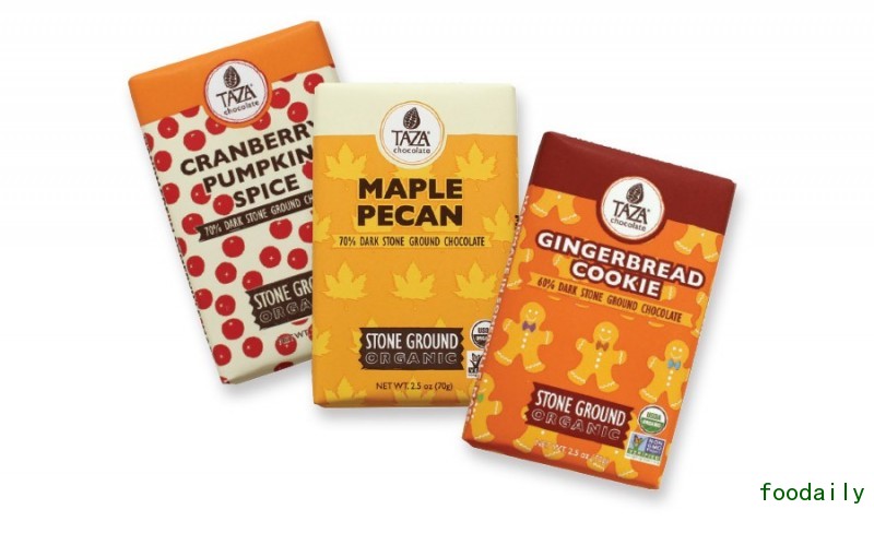 Taza巧克力,一家有机石磨巧克力,主要生产巧克力豆和巧克力棒。最近,该公司在其Amaze Bars系列产品中加入了三种全新口味。首先是永久加入的Maple Pecan口味,富有浓郁的烤胡桃味,以及一丝枫树清香,配上Taza公司特有的未提纯的70%黑巧克力。其次是Cranberry Pumpkin Spice ,这是两款季节性巧克力棒中的一款,70%黑石磨巧克力加上蛋挞小红莓,以及南瓜饼调味料和南瓜子。第三款是用于节日庆祝的Gingerbread Cookie 口味,60%黑巧克力配上肉桂、生姜、肉豆蔻,以及姜饼。