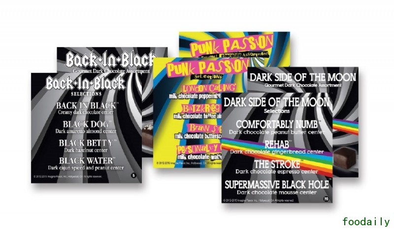 Imagine巧克力公司富含流行文化,其巧克力产品极具音乐晾干,以“音乐激发的巧克力感受”让你的味蕾摇滚起来。产品基于可用于收集的包装,包括Genre音乐主题和era音乐主题。最近的几款新产品包括:Back in Black(回归黑暗), Dark Side of the Moon(月球暗面), Punk Passion(朋克激情), 以及Girl Power(女孩力量)。