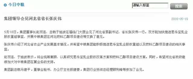 在中粮上述名为《集团领导会见河北省省长张庆伟》的文章中,河北省委副书记、省长张庆伟“希望中粮集团能积极推进君乐宝乳业股权重组”。对此,”赵双连、于旭波表示,将会统筹兼顾、认真研究君乐宝乳业股权改革方案……同时,希望河北省政府继续加大对中粮集团在冀业务的支持”。