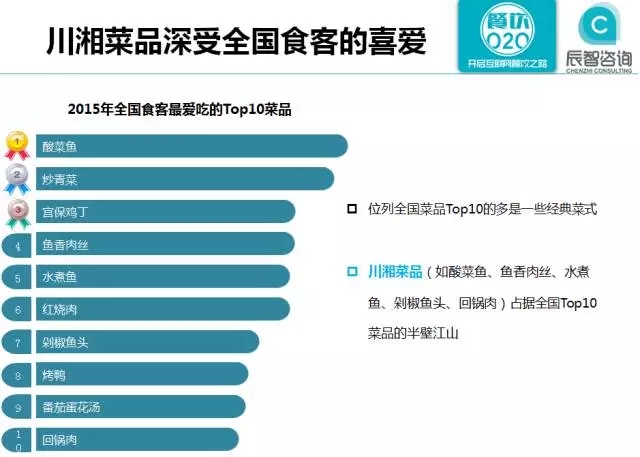 这里面川湘菜占到全国的Top10菜品的半壁江山,我们研究看现在人的口味都是重口味,他们都需要川湘菜品的麻辣刺激。