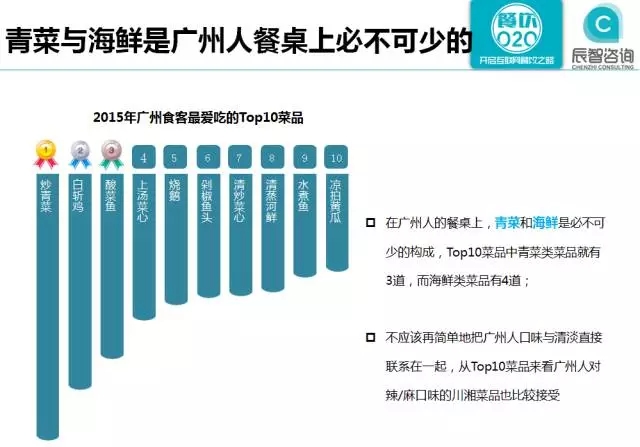 1、首先来看一下全国2015年十大菜品,酸菜鱼、炒青菜和宫保鸡丁这三个是Top3。全国十大流行菜品主要还是经典菜式,因为中国人的味蕾还是习惯传统口味,也说明了餐饮回归到产品本质。