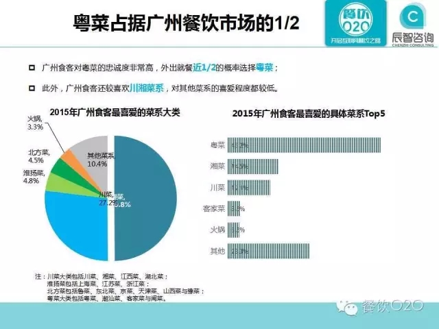 13、粤菜在广州的消费市场过半,占比49.8%。川菜占到27.2%,也是比较大的比例,这两样超过60%,包括客家菜最近在广州也是非常火,因为是回归传统的做法。