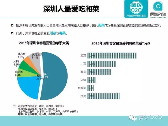 5、到了深圳呢,外来人口居多,所以川湘菜比例很大,特别是湘菜,这个与广州有明显差异,剁椒鱼头、回锅肉、辣子鸡分列前三位。我们看消费者最喜欢的菜系,首先看一下川湘菜是独占鳌头,我们可以看到川菜占20%,湘菜占9%,所以这个机会很大,所以在座各位都有发展的机会。有了这种机会,大家舍命狂奔。