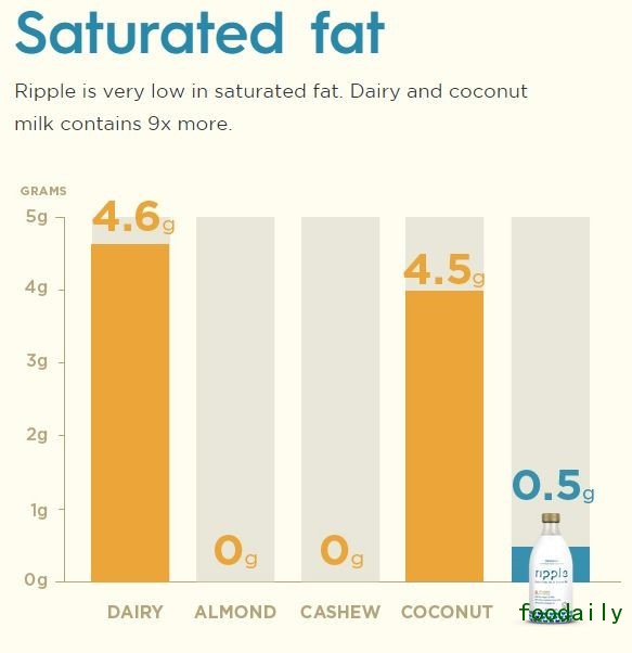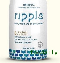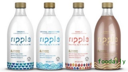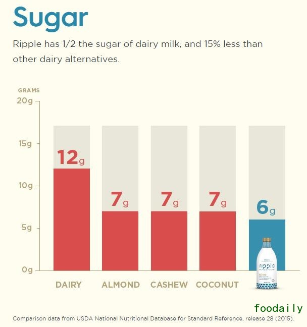 Ripple是一款蛋白质含量高(每份8盎司含有蛋白质8克,原味)、含糖量低(每份8盎司含糖6克,原味),无乳成分、过敏原友好(无大豆、无乳、无坚果)的饮料,相比2%蛋白含量的杏仁奶,该产品热量降低20%,饱和脂肪酸只有杏仁奶的1/6,含糖量只有一半,蛋白含量为杏仁奶的8倍。