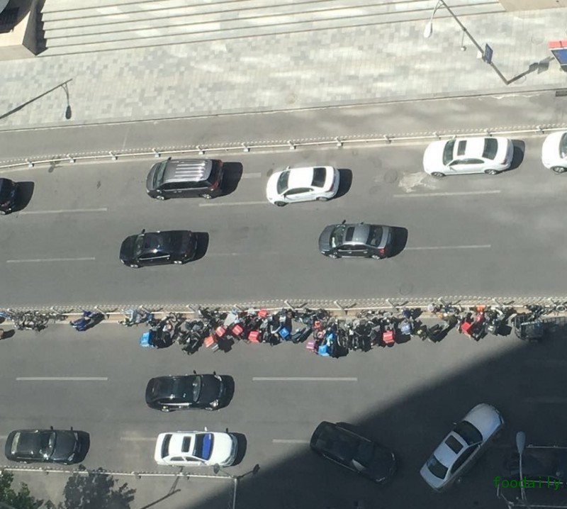 每天午饭时间,北京建外 SOHO 楼下的路口都会停一排饿了么、美团外卖、百度外卖的电动车。