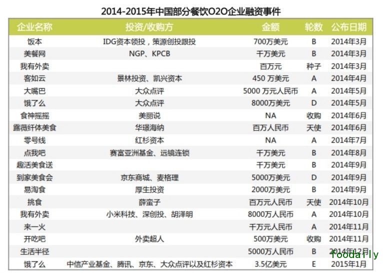 2014 年 1 月,大众点评和美团先后上线外卖频道。4 月,百度收购糯米并推出自己的外卖服务。5 月,饿了么获得大众点评等 8000 万美元注资。9 月,到家美食会完成 5000 万美元 D 轮融资。2015 年 1 月,饿了么获得新一轮 3.5 亿美元融资……