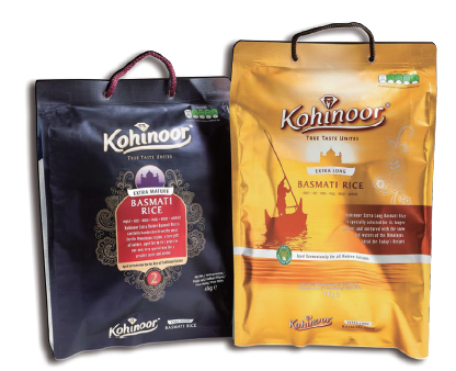 Kohinoor 大米包装袋用三层柔性薄膜(BOPP 薄膜/ 金属化BOPET 薄膜/LDPE 薄膜)制成;采用轮转凹版印刷技术进行八色哑光反转印刷。