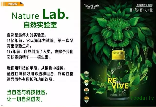 从外观来看,墨绿色的背景点缀绿叶和鸭绒黄Brand,显得凝重、内敛、蓄势待发;从卖点看,全部采用国外原料,不添加牛磺酸等人工合成化学成分,也符合“大健康时代”的消费需求;从价格来看,接近20元的单瓶售价应该也只有一二线城市才承受得起了。