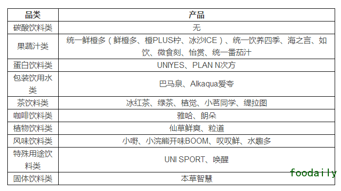 按照GBl0789-2015《饮料通则》的分类,我国饮料可分为:包装饮用水、果蔬汁类及其饮料、蛋白饮料、碳酸饮料(汽水)、特殊用途饮料、风味饮料、茶(类)饮料、咖啡(类)饮料、植物饮料、固体饮料以及其他饮料共十一大类。自1992年进入内地,24年来统一打造了很多经典饮料产品,其在品类上的布局也越来越丰富——