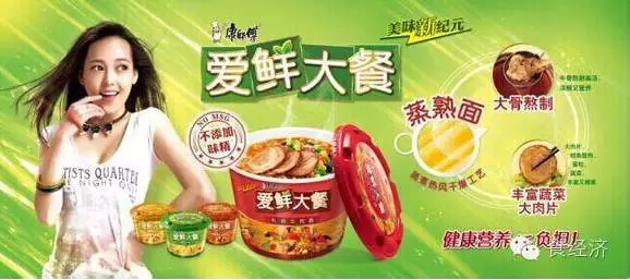 康师傅倒没有统一那么搏出位,今年推出的爱鲜大餐定位中端市场,售价为6元/桶,比康师傅传统的桶装方便面略贵一点。爱鲜大餐打的是健康牌,不添加味精采用蒸煮面。