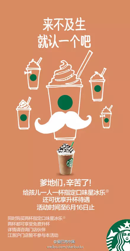 普通的节日营销活动,和星巴克的其他social创意比起来不算什么。亮点在于抓住了85后90后喜欢认“干儿子”的习惯,加上了“来不及生就认一个吧”的梗作为包装。