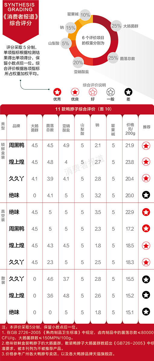 综合测评结果显示,在锁鲜盒装鸭脖子中周黑鸭和煌上煌排名较优,真空包装中周黑鸭和绝味排名靠前。此外,散装鸭脖子因其大肠菌群较高,绝味锁鲜盒装大肠菌群超标,被本刊列为不被推荐产品。
