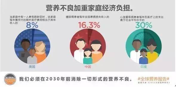 最新发布的《2016全球营养报告》指出营养摄入不均导致的疾病加重家庭的经济负担。 以中国为例,每10个成年人当中就有1人患有糖尿病,每年的医疗开支不容小觑。不健康饮食是导致糖尿病在中国呈爆炸式增长的主要原因之一。 让我们为了自己和家人积极行动,关注营养。