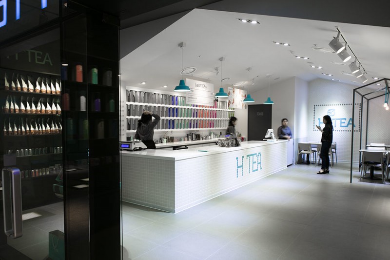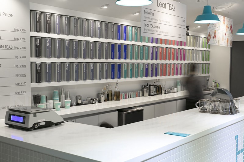 韩国首尔有这么一家看上去很冷淡的茶叶店 H Tea,minimalist 在设计时以蒂凡尼蓝和黑白作为主色调,呈现出一种酷酷的现代感。H Tea 的茶叶被储存在圆柱形的铁罐里,设计师们设计了一套次级调色板以区分不同种类的茶叶。茶罐整齐划一地摆放在白色的货架上,既是展示又起到了装饰的效果,让人眼前一亮。
