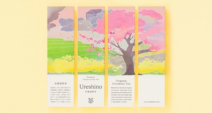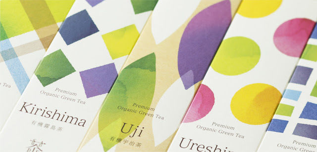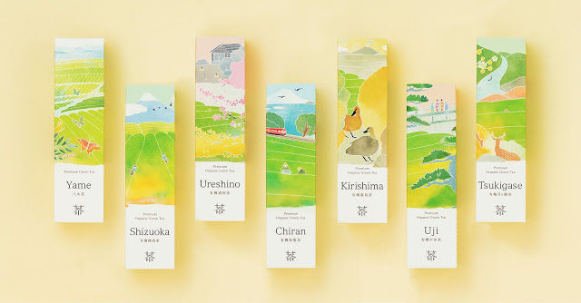 日本的茶叶品牌 Saudade 采用了水彩画作为外包装,canaria inc. 特意设计了两套不同的风格。一种是讲述了茶叶故事的插画,明快的颜色描绘出了一幅幅清新自然的田园景象,带领人们进行一次“茶叶之旅”,强调了茶叶的“有机”概念。另一种风格则使用了各种不规则图案,同样透露着淡雅的和式风情。