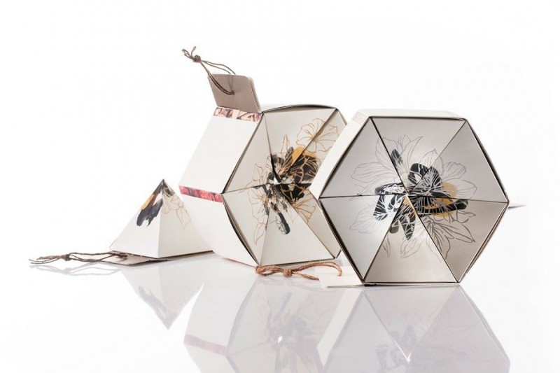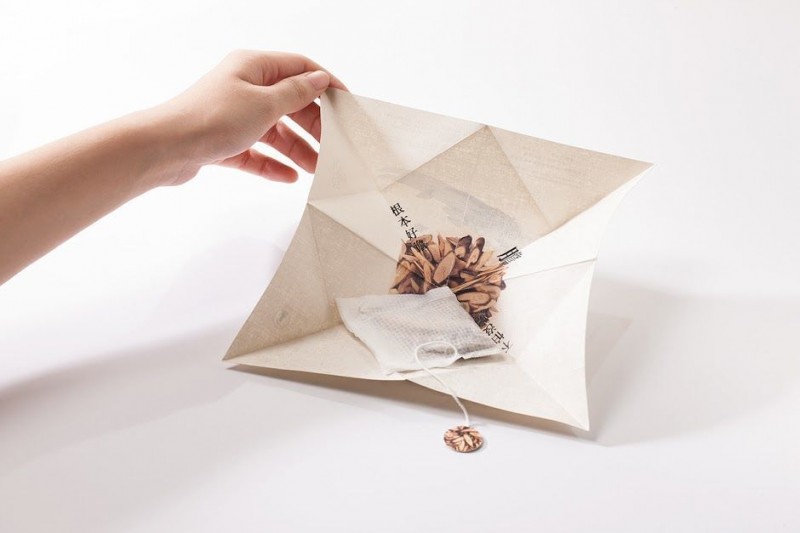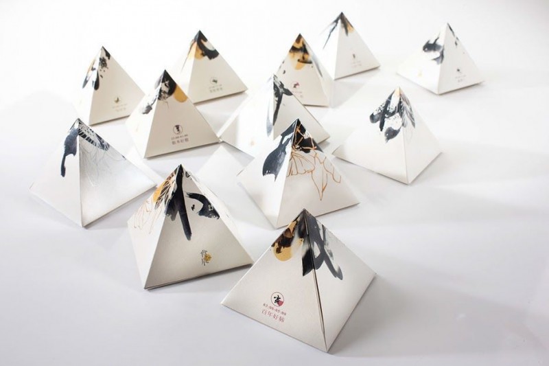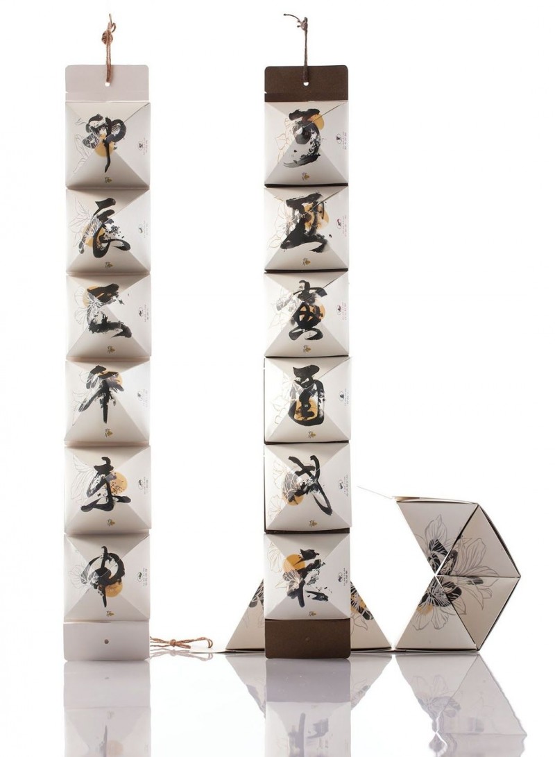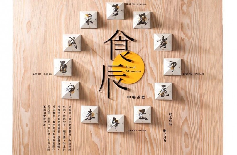 台湾的“食辰”是一款不太一样的茶叶,对应器官的运作时间,有针对性地调配出了 12 款中药茶饮。每一种茶叶都被装在金字塔形的小纸盒中,由上而下可以看到别致的设计字体。纸盒分为日夜两组,一侧标注了时间和单品名称,另一侧则烫上金银两色的局部图案,把一组拼在一起时就会显示出一朵完整的花。