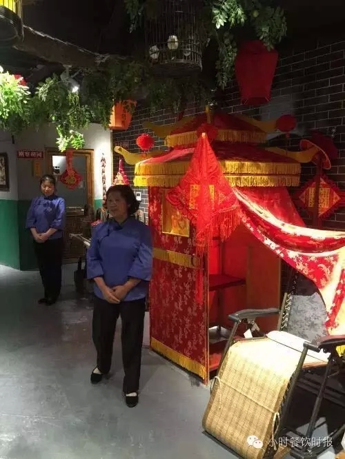装潢均为董事长尹彪亲自设计,怀旧的装饰主打民国时期北京四九城的风格,所以在就餐体验上,极易让顾客产生穿越的错觉。比如,在餐厅大门有个铛铛车的设计,顾客进门之后,需要先坐上铛铛车,由服务人员将车拉到指定位置。——有点“王爷公主”的享受……