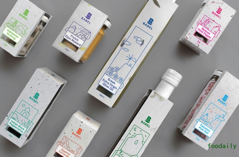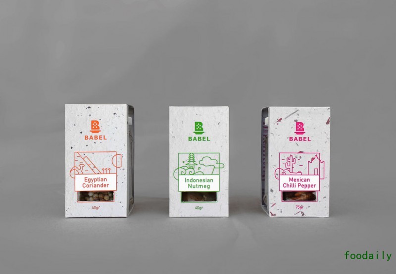 BABEL 的食材系列包装是希腊设计学生 Makrina Oikonomidou 的毕业作品。为了强调食材丰富的来源地,Oikonomidou 设计了一套调色板,搭配了代表产地的标志性图案和文字说明。每一个包装盒所使用的纸由Oikonomidou 手工制成,这个过程中还加入了对应的食材,包装上斑驳的颜色也是因此而来。为了让顾客更清楚地看到食材,盒子的左右两侧采用了镂空设计。