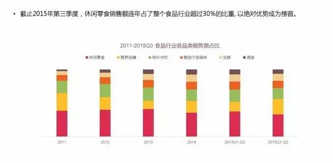 数据显示,休闲零食的销售额从2011年开始,连续多年霸占着整个食品行业份额第一的榜首位置,连续多年占到了整个食品行业30%的比重,关键是:优势非常明显。