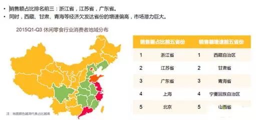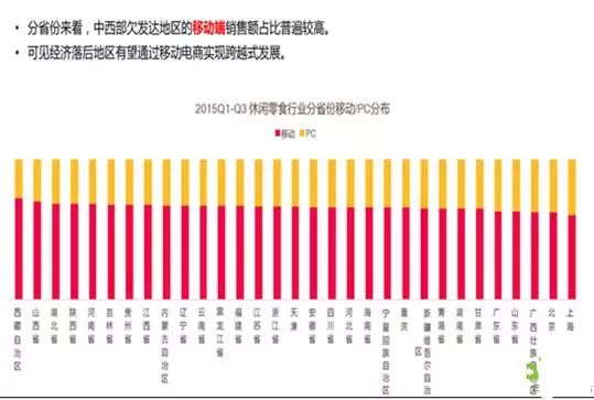 《报告》显示,零食销售排名前三的是:浙江省、江苏省、广东省,整个二线城市以接近50%的分布占据了休闲零食消费的主力军。但是,同时,西藏、甘肃、青海等经济欠发达的地区,增速非常快,市场潜力巨大。同时,还有一个更为重要的特点:中西部等经济欠发达的地区,移动端消费的比重更高。