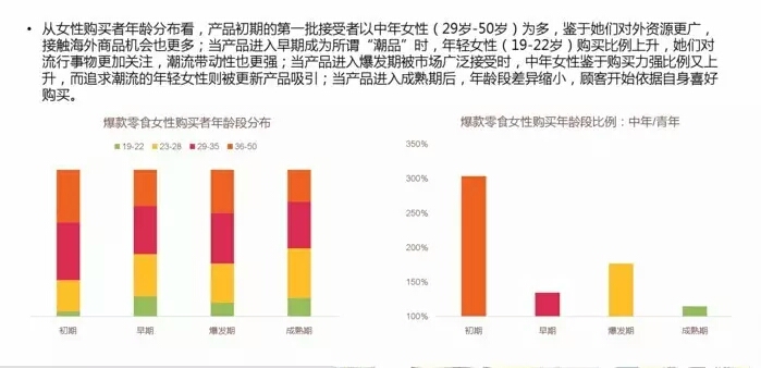 从女性购买者年龄分布来看,产品初期的第一批接受者以29到50岁这一年龄段为多,因为他们的对外资源要更为广泛,接触海外商品的机会也比较多;当产品进入早起成为所谓的潮品的时候哦,年轻女性购买比例上升,他们对流行事物更加的关注;当产品进入爆发期被广泛接受的时候,中年女性的购买比例又会大幅度上升。