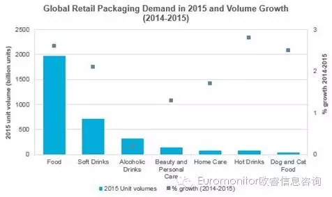 然而2015年,对于需要使用包装的行业来说并不是乐观的一年。但全球的包装行业依旧呈现增长的趋势,而增长放缓的原因则与经济不稳定,政局出现波动等因素相关。酒精饮品包装的减速最为明显,较于2010-2014年年均1.3%的增长点,2015年整体需求只增长了0.2%。随着俄罗斯和乌克兰消费者对啤酒及烈酒购买力的下降,对玻璃包装打击最为严重。除这些国家以外,对食品包装,饮品包装,日化品以及家居用品包装都是尤为乐观的一年。 2015年,包装行业增长最快的几个国家是中国,印度,印度尼西亚和美国。