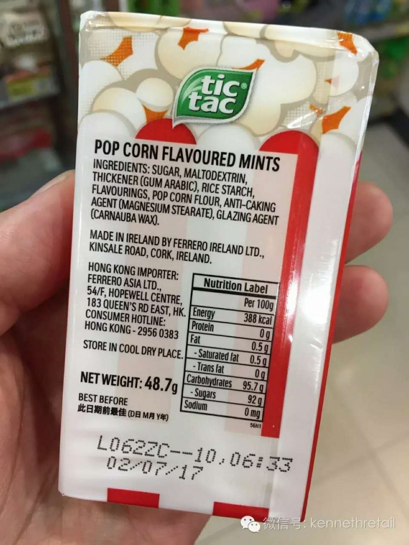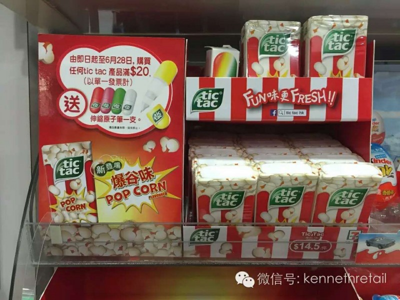 这款爆米花味道的Tic Tac 糖在香港7-11有售,还有特别的陈列突出产品!此款售价为$14.5 , 比一般味道的包装大而贵一点。