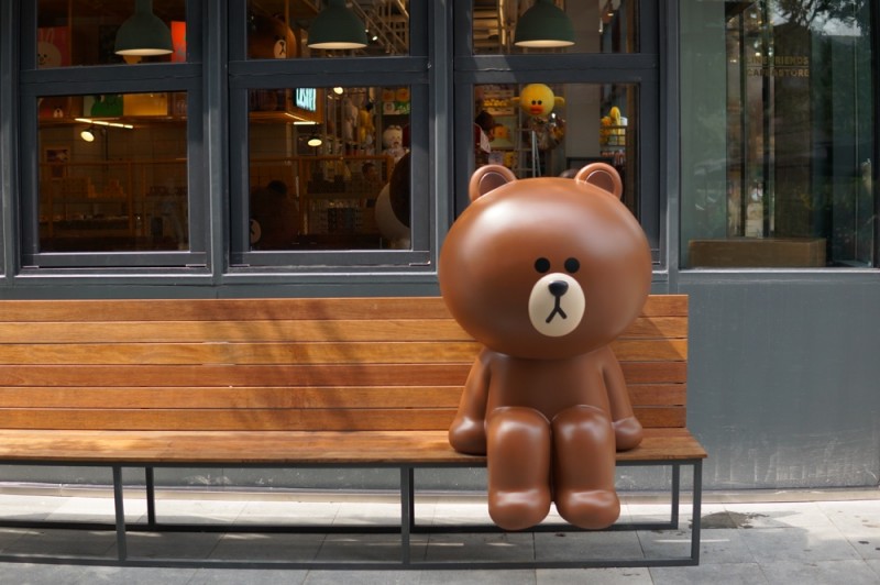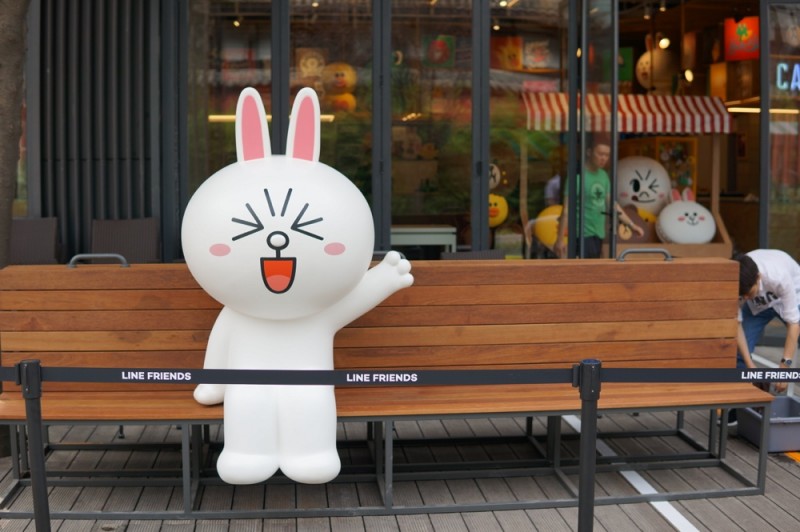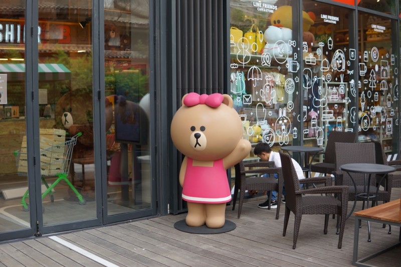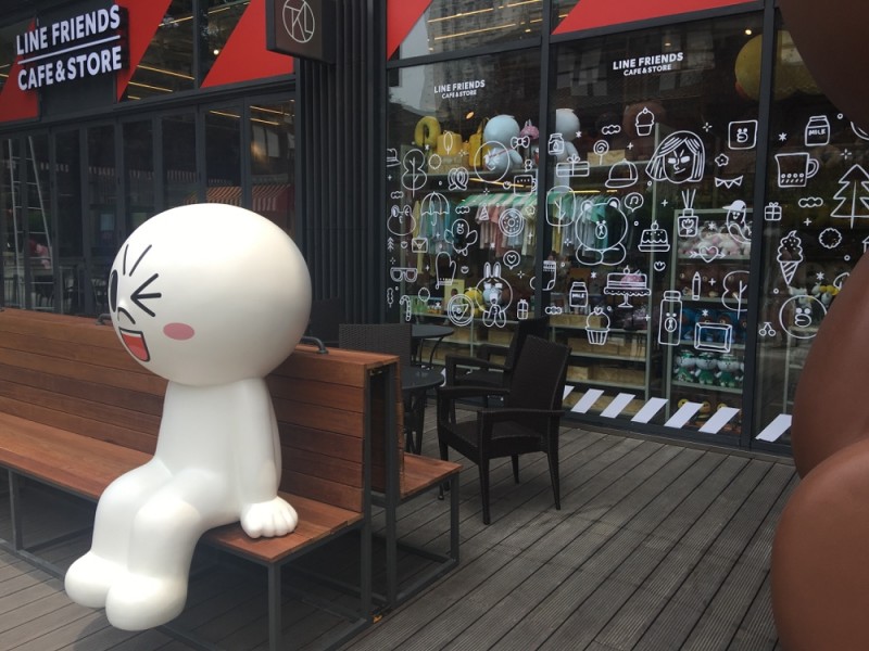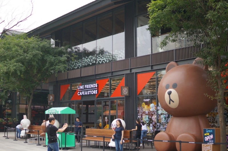 这家LINE FRIENDS CAFE&STORE在太古里的“东里”,紧靠着红邮筒和新元素两间餐厅,本来就是休闲功能相对集中的区域。走到店门口就能看到巨大的布朗立像,可妮、穆恩和新加入的角色邱可也都出现在店门口,可爱到让人忍不住连拍起来。