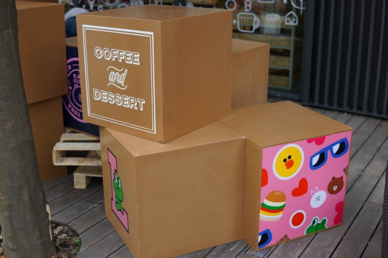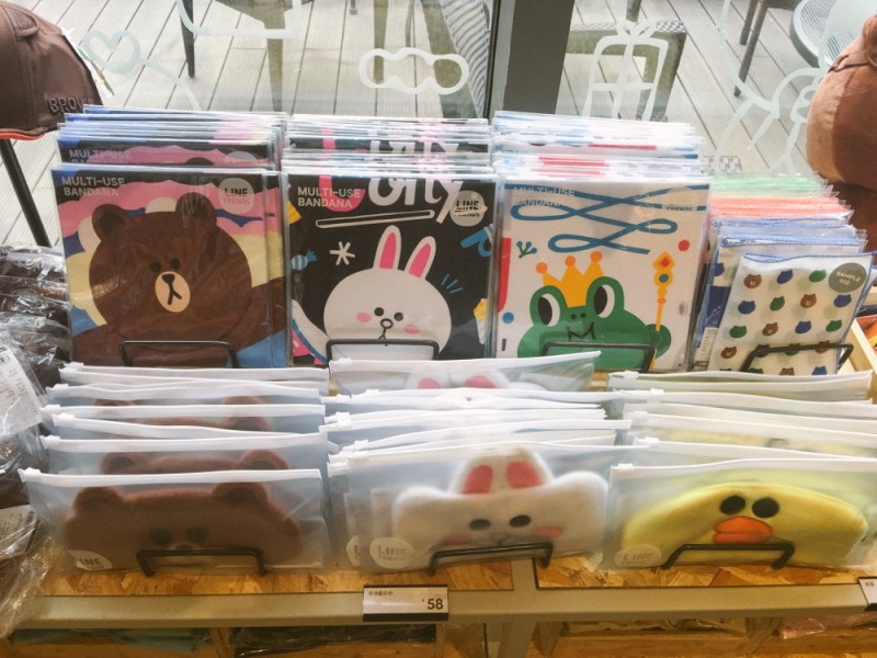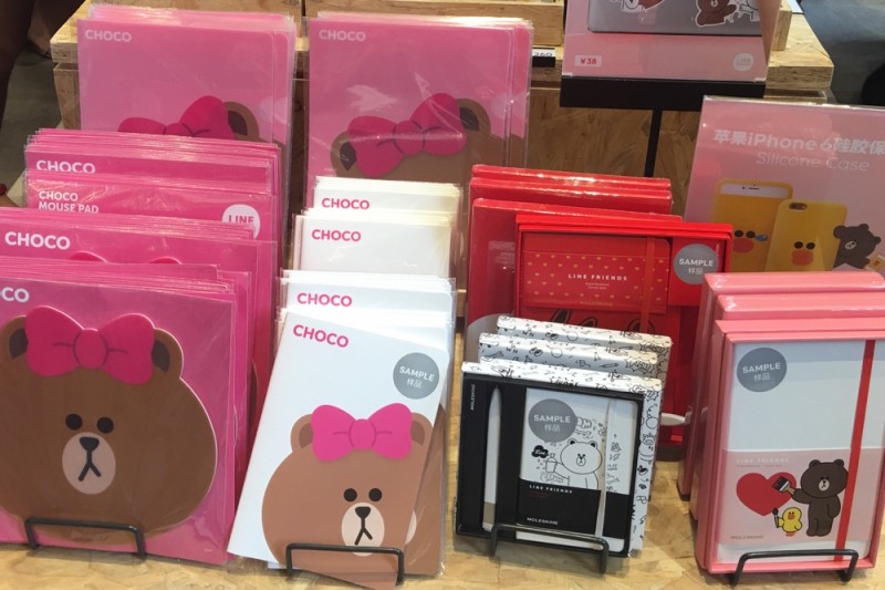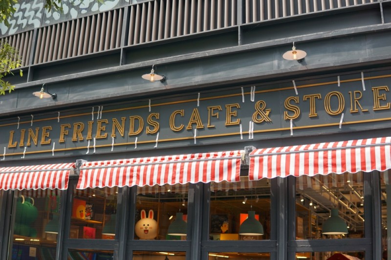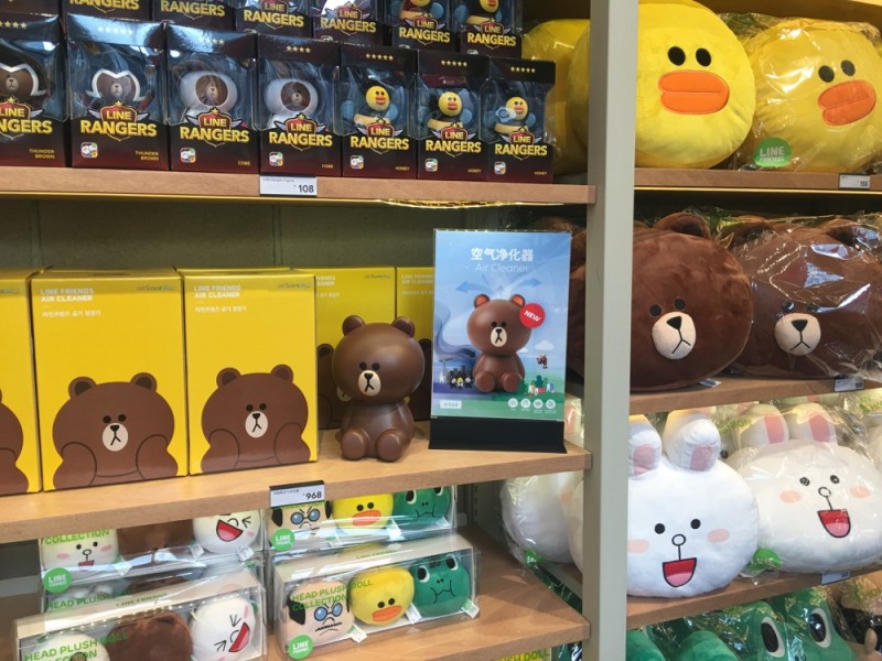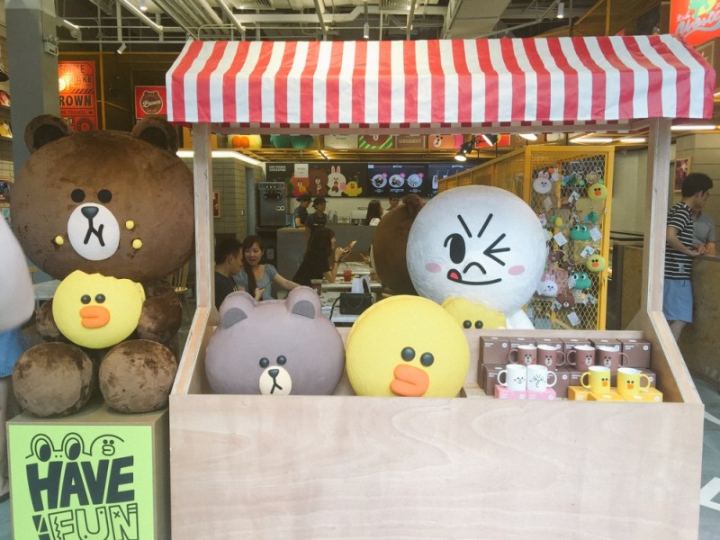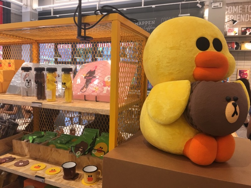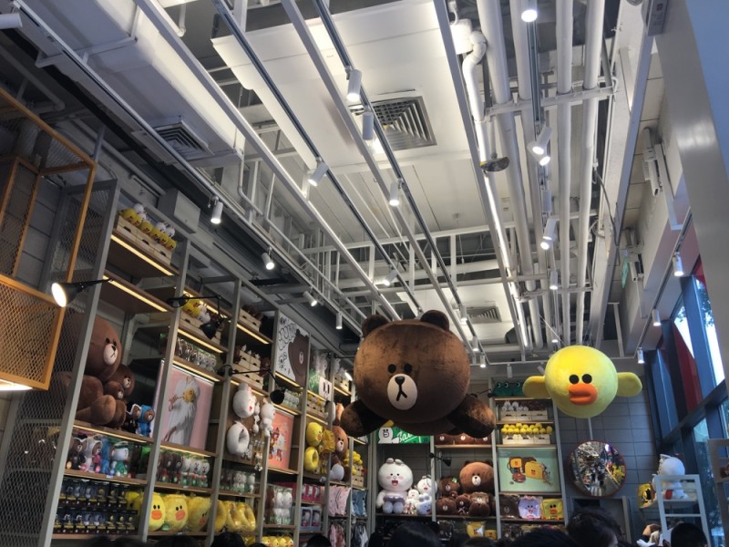 然而走进去之后发现,果然还是如出一辙的工业风格,天花板处交错排列的管道设计、水泥地面、周转箱一样的陈列架都在中和着LINE FRIENDS本身形象带来的呆萌感。当然啦,随处可见的主人公们才是大家镜头对准的焦点。