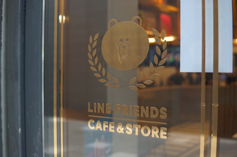 从外面看起来,整间店流露出一种美式的轻松惬意,侧面上的店招、玻璃门上烫金的小logo、布朗立像旁边的小箱子都和上海那家LINE FRIENDS CAFE&STORE有所区别。
