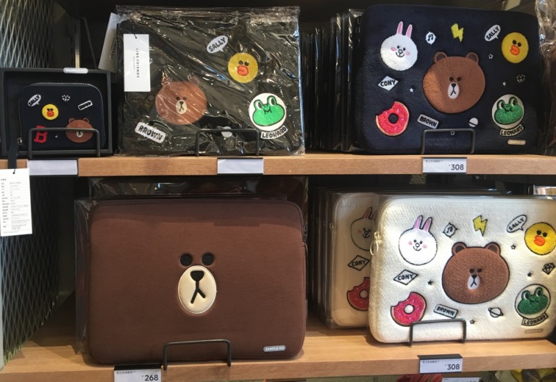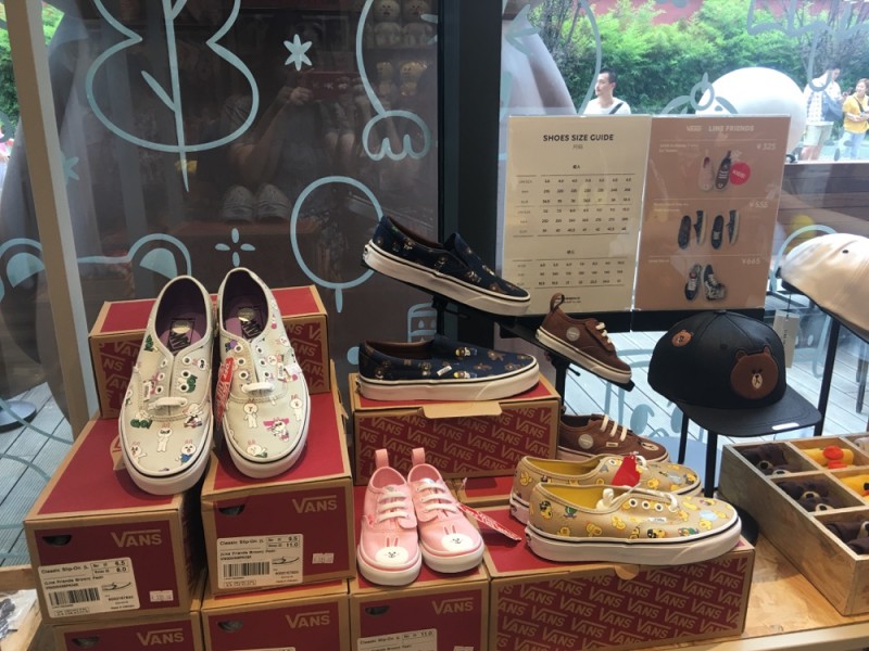 这家LINE FRIENDS CAFE&STORE店内面积不算太大,分成了餐饮区和周边贩卖区两部分。周边贩卖区域布局得相当紧凑,除了之前在快闪店里就有的文具、雨伞,还有一些新的品类,像是电脑内胆包、新造型玩偶,连之前和VANS合作、上架就被抢售一空的限量鞋款也有出售。而且周边还划分了儿童区和成人区域。