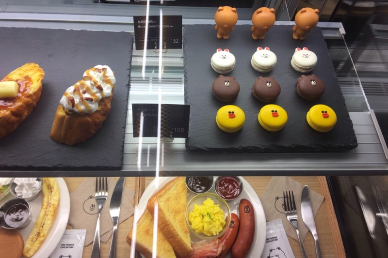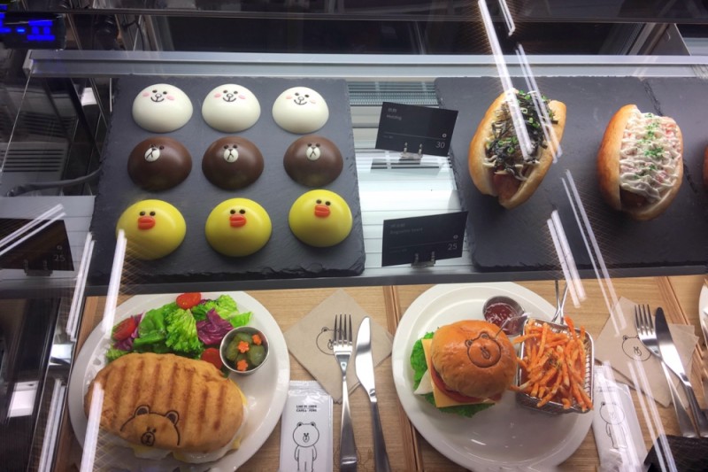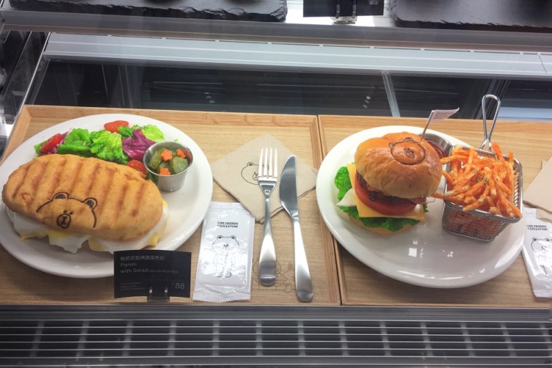 挂着CAFE的名号,餐饮部分当然是重头戏码,事实上这间店的大部分区域也都留给了吃喝休息。这里提供精心准备的LINE FRIENDS主题餐点,餐具们都做成了LINE FRIENDS形象当然不用说,食物本身也成了LINE FRIENDS形象的集中展示。本身就是圆形的麻薯和马卡龙都变成了LINE FRIENDS的形象,你可以吃到巧克力味的布朗,或者咬一口看起来就酸甜到位的莎莉。连汉堡和热狗也点缀上了布朗的形象,就是要让你买买买嘛。