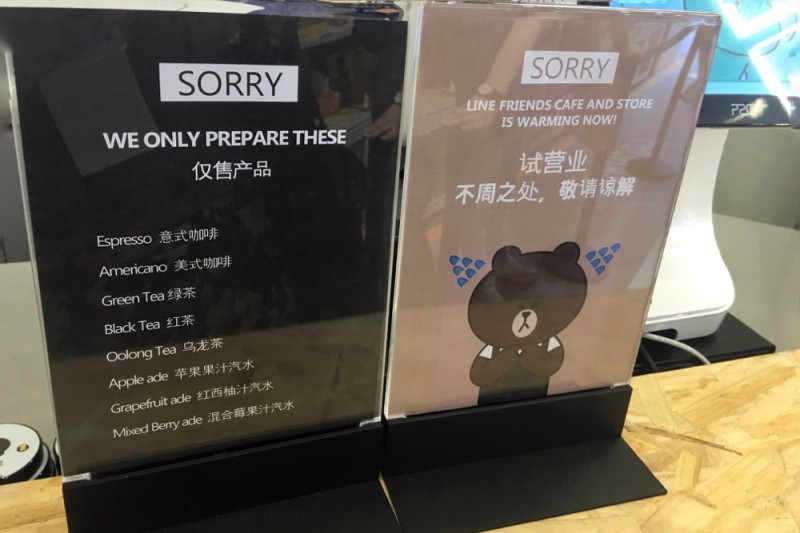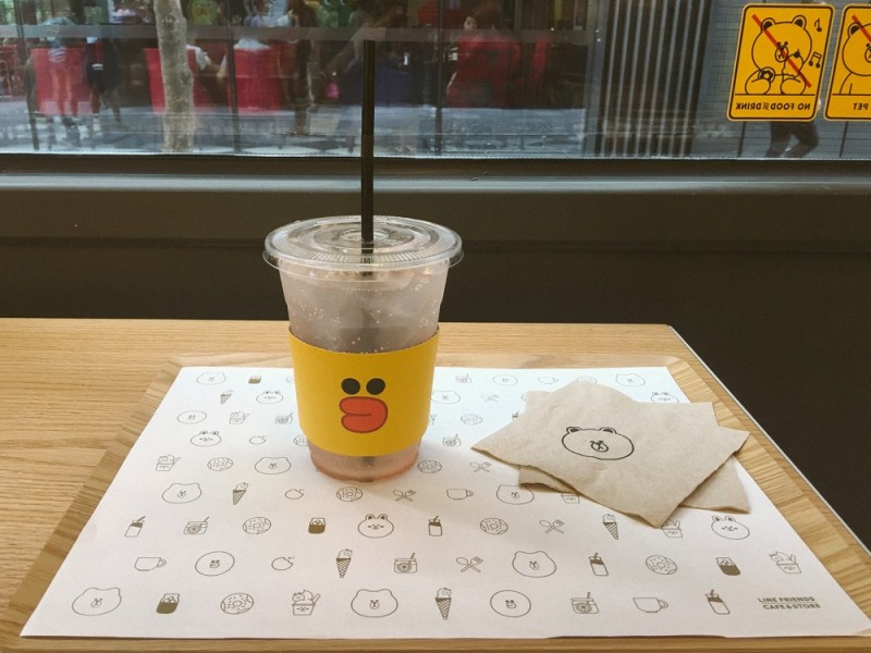 点餐完毕的叫号器也是布朗的形象。饮品制作速度挺快,餐盘垫纸和纸巾也都印有LINE FRIENDS的形象——在每一个细节都做到位,或许是LINE FRIENDS能吸金无数的原因之一吧。