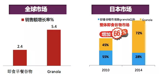 尤其是Granola谷兰诺拉水果麦片这个细分品类,2015年全球销售额突破$4.4billion(折合人民币280亿),以日本市场为例,Granola谷兰诺拉水果麦片的增长推动了整个即食谷物市场的成长。