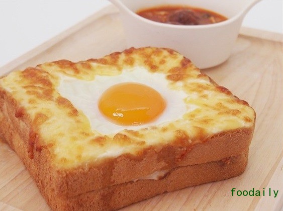 虽然在现场品尝肯定更有气氛,不过这道美食你在家中也能自己动手制作。方法也非常简单,加热一下厚吐司,变软后在吐司边缘挤上蛋黄酱,然后在中心打上一颗鸡蛋,垫上锡纸放进烤箱,以 230℃ 的温度加热 2-3 分钟左右就可以完成啦。