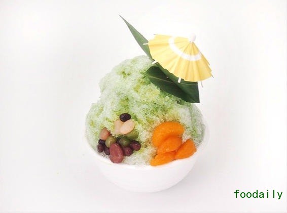 这道抹茶雨伞刨冰的创意来源是 1988 年的动画电影《龙猫》,刨冰上面还插着一把迷你伞,价格为 750 日元。