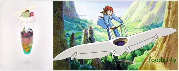 这道甜品是《风之谷》的主题纪念芭菲,在抹茶冰淇淋的最上方还有一个用白巧克力制作的滑翔机,它的价格是 1280 日元。除了上面这几道主题美食外,还有草莓牛奶金平糖刨冰、海鲜红咖喱、天空奶油苏打水等等。