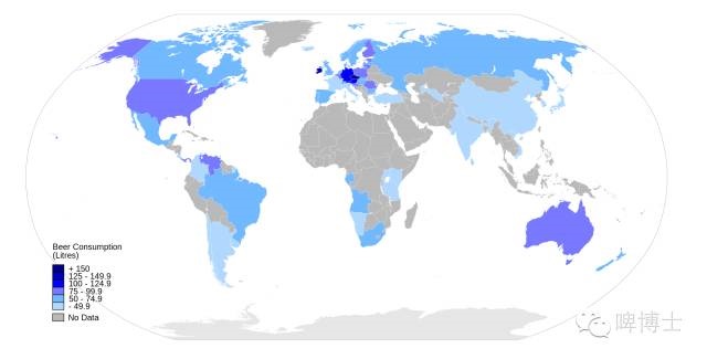 世界啤酒年人均消耗量分布图