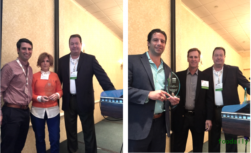 左图:Dairy Foods发行人Tom Imbordino(两图中图右者)为Prairie Farms Dairy Inc.的Charles Mack和 Rebecca Leinenbach颁发该公司海盐焦糖牛奶的最具创新产品奖。