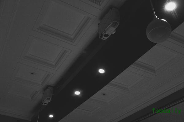 由于裸眼 3D 秀对于投影和观赏的角度有所要求,你在现场可以发现 12 人用的餐桌和头顶的投影架在底部实际上是焊接在一起的,这样可以确保桌面不会被人为地移位。