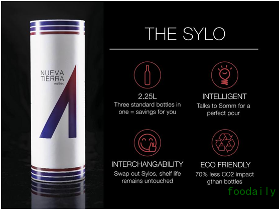 这个Sylo储酒槽的容量相当于三个750毫升的玻璃瓶,它的成分也是可以完全回收利用的。相比于玻璃酒瓶在生产材料,重量运输,空间和储存等过程产生的二氧化碳,Sylo的包装生产过程减少了62%的二氧化碳排放量,同时减少了原料回收的能耗。