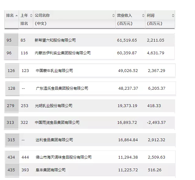 其中食品行业有以下企业入榜: