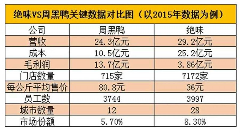 绝味在2015年的销量超过83000吨,周黑鸭只有27000吨。绝味卖得多,成本自然也高——绝味去年采购鸭脖子等原材料的成本高达19.6亿元,周黑鸭只花了7.4亿元。