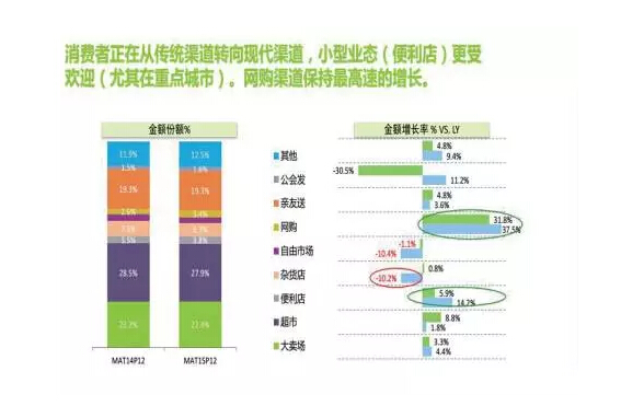 渠道方面又发生了哪些变化呢?消费者正在从传统渠道转向现代渠道,像大卖场、 超市、 便利店的渠道增长都是比较好的,而像传统渠道如自由市场、 杂货店则处于一个下滑的趋势。电商等新兴渠道则处于一个高速的发展状态。